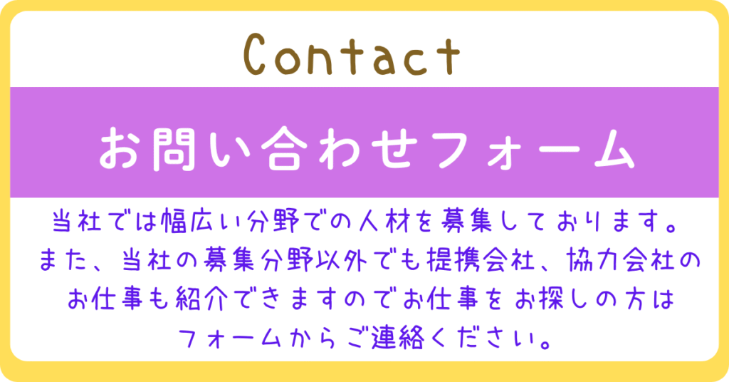 当社では幅広い分野での人材を募集しております。また、当社の募集分野以外でも提携会社、協力会社のお仕事も紹介できますのでお仕事をお探しの方はメッセージフォームからご連絡ください。お気軽にご相談・お問い合わせください